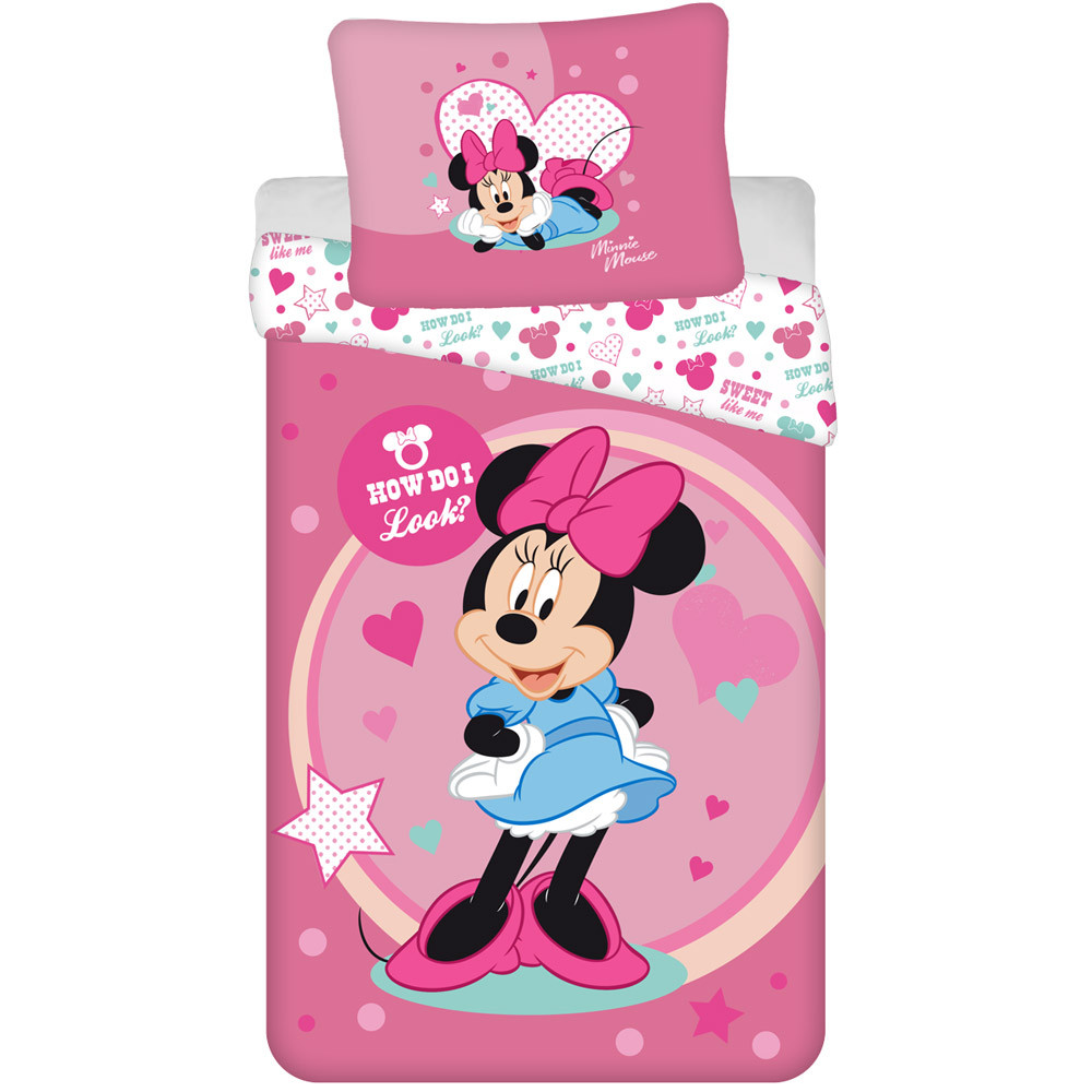 Im Zentrum des Designs strahlt die reizende Minnie Mouse in einem lebhaften blauen Kleid, umgeben von Herzen, Sternen und kleinen liebevollen Botschaften wie "How do I look?" oder "Sweet like me". Der rosafarbene Hintergrund, in verschiedenen Nuancen gehalten, verleiht dem Zimmer eine warme und fröhliche Atmosphäre und spiegelt die charmante Welt von Minnie wider. Der Kissenbezug greift die gleichen grafischen Elemente auf, mit einem Porträt von Minnie, die sich ausgestreckt mit einem schelmischen Lächeln auf den Lippen präsentiert, um jede Nacht liebevoll zu begleiten.