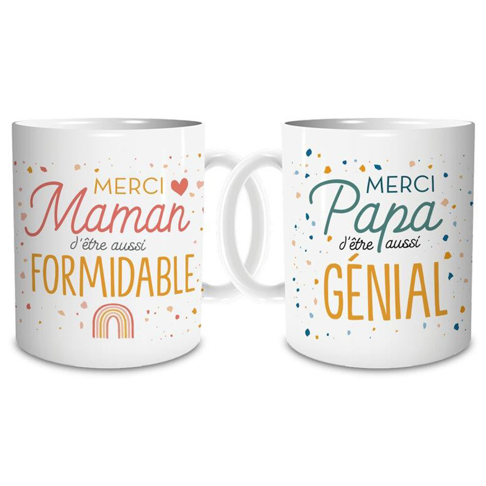 Das Design dieser Tassen ist elegant und warm, verziert mit sanften Farben und festlichen Mustern. Die Tasse "Thank you Mam for being so Great" ist mit raffinierter Schrift und einem kleinen bunten Regenbogen verziert, einem Symbol für Glück und Wärme. Die Tasse "Thank you Dad for being so Great" zeichnet sich durch moderne Typografie und bunte Blitze aus, die Fröhlichkeit ausdrücken. Diese grafischen Details verleihen diesen Tassen eine einzigartige und fröhliche Note, die perfekt ist, um den Tag Ihrer Eltern zu verschönern.