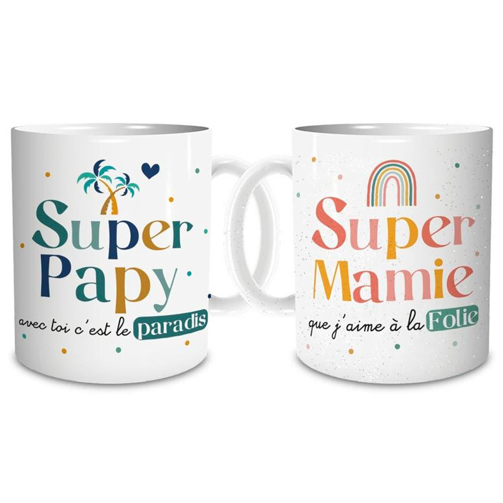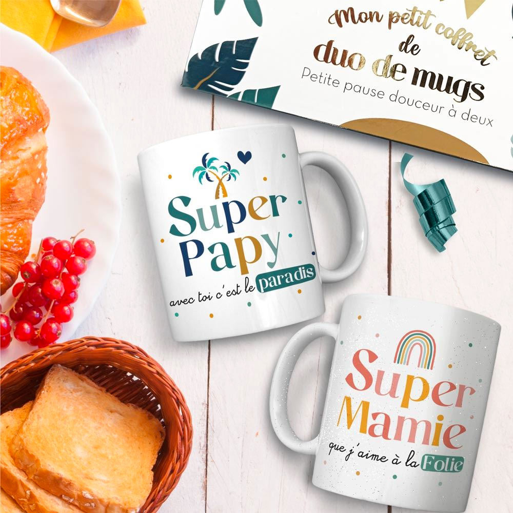 Machen Sie Ihren Großeltern eine Freude mit diesem Duo-Set von Tassen Super Opa & Super Oma, eine liebevolle Aufmerksamkeit, um sie so zu feiern, wie sie es verdienen. Präsentiert in einem hübschen Set, tragen diese beiden passenden Tassen zärtliche und fröhliche Botschaften: „Super Opa, mit dir ist es das Paradies“ und „Super Oma, die ich wahnsinnig liebe“. Jede Botschaft wird von einem bunten Motiv begleitet – Palmen für Opa, Regenbogen für Oma – und durch Glitzerdetails ergänzt, die eine Prise Fantasie und Licht hinzufügen.