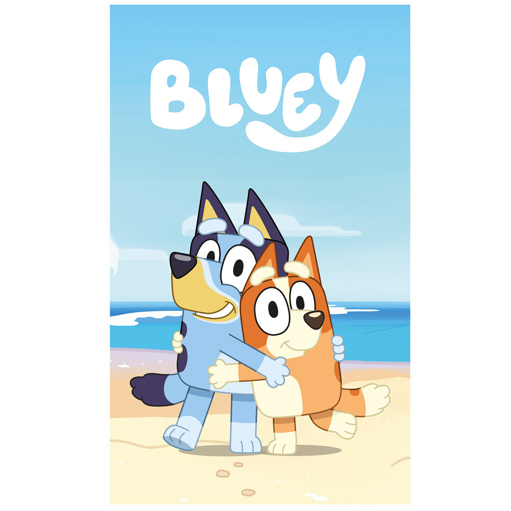 Diese Plaid zeigt Bluey und ihre Schwester Bingo, die bezaubernden Helden der australischen Animationsserie, die Familien weltweit begeistert. Mit ihren Abenteuern voller Fantasie und Lachen inspirieren diese beiden Charaktere die Kinder, die Welt durch Spiel, Zusammenhalt und familiäre Liebe zu erkunden. Die fröhliche und farbenfrohe Illustration, die auf einem sonnigen Strandhintergrund gedruckt ist, zaubert sofort ein Lächeln ins Gesicht und erhellt jedes Kinderzimmer.