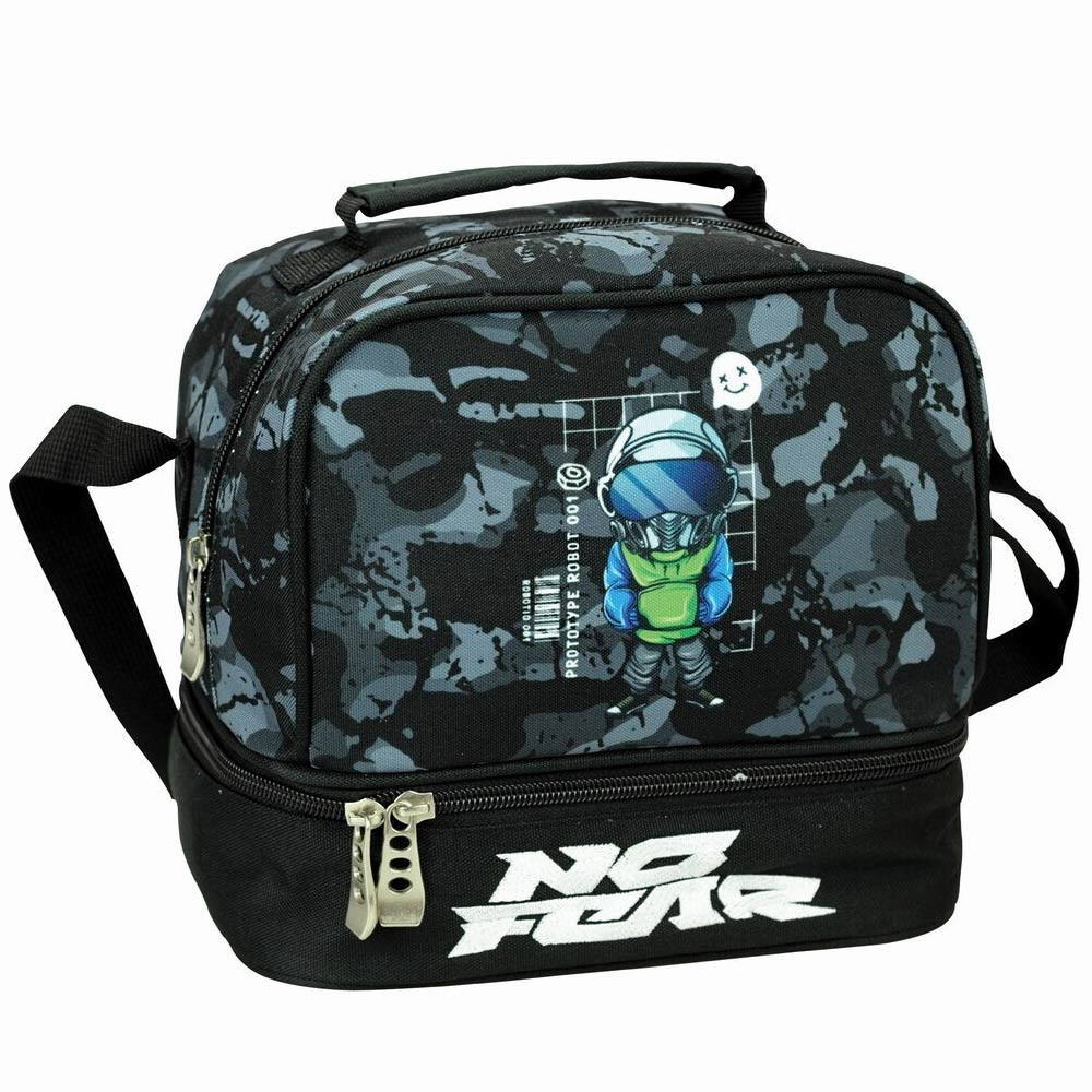 Die No Fear Robot Lunch-Tasche ist der ideale Begleiter für die Mittagspausen kleiner Abenteurer mit ausgeprägtem Stil. Mit ihrem modernen Look, der schwarzes und graues Camouflage mit einem futuristisch designten Roboter kombiniert, fällt sie weder in der Kantine noch bei Schulausflügen unbemerkt auf. Dieser kleine Roboter, der Helm und Anzug trägt, verkörpert Kühnheit, Neugier und Einfallsreichtum – Eigenschaften, die jedes Kind im Laufe seiner Tage annehmen kann.