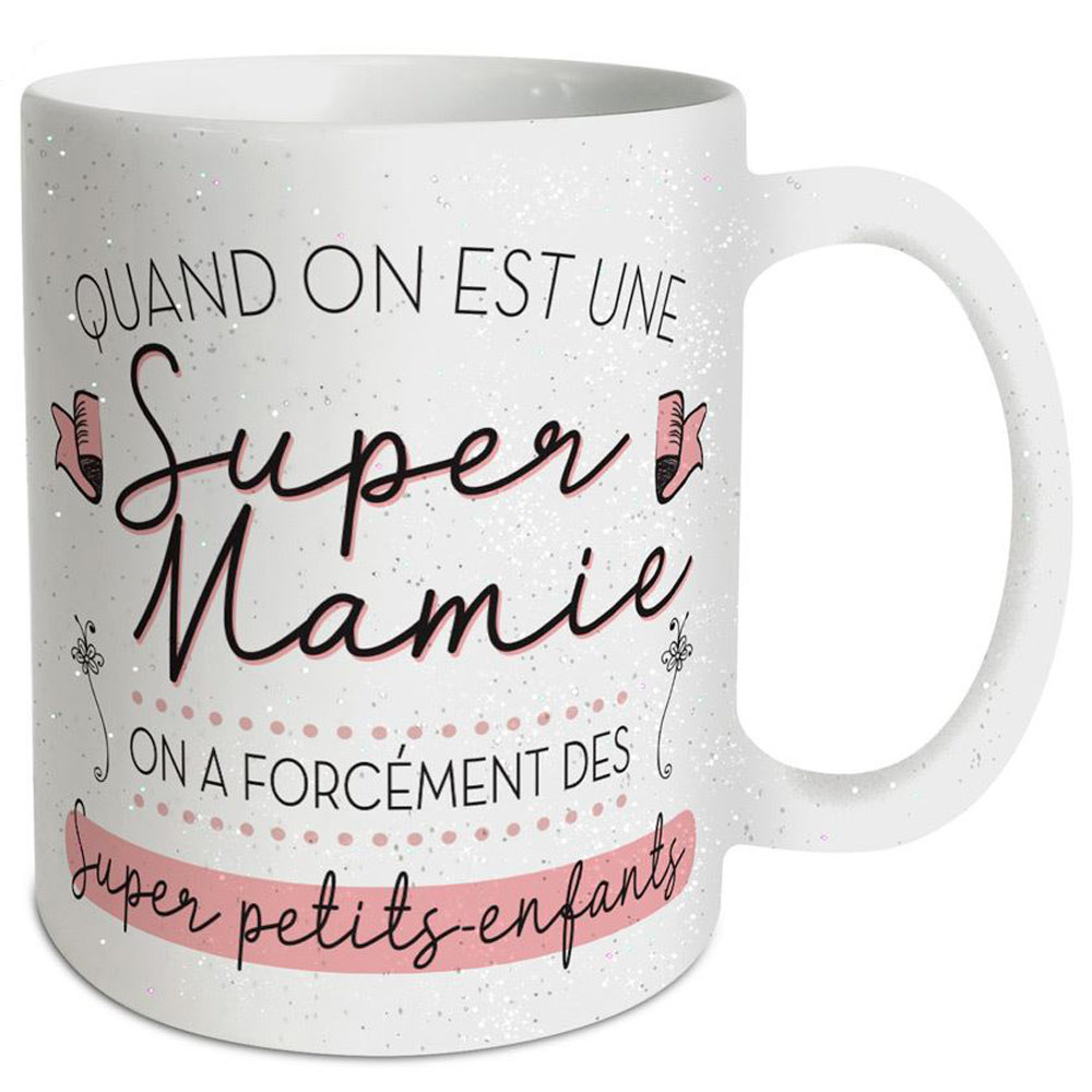 Its endearing inscription — "When you're a Super Grandma, you surely have super grandchildren" — is printed front and back to be readable from any angle. The white background sprinkled with sparkling glitter highlights the lovely touches of pastel pink and black, in a modern and warm typography. A glossy finish underscores the charm of this mug, which stands out both in the kitchen and on a breakfast table.
