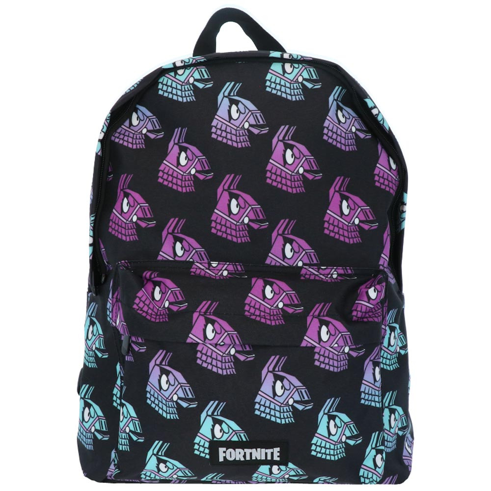 Dive into the colorful world of Fortnite with this Fortnite Lama Borne 40 cm backpack, a piece that is both practical and stylish to accompany children to school or on outings. True to the famous game universe, this bag features a playful pattern depicting the iconic loot llama, in gradient shades of purple, turquoise, and blue on a black background. This bold design will immediately appeal to young Fortnite fans, allowing them to express their personality through an original and dynamic accessory.