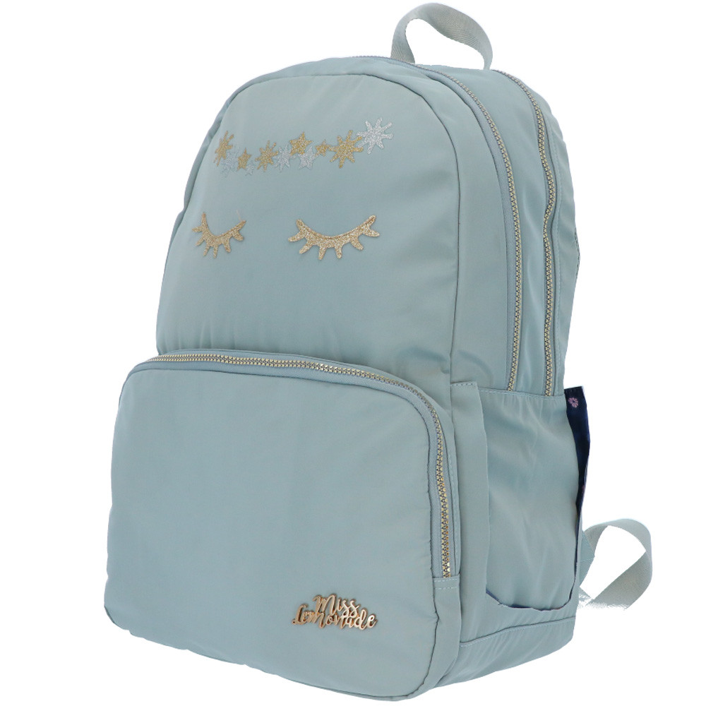 La mochila Miss Lemonade Sleeping de 45 cm combina elegancia y funcionalidad, perfecta para estudiantes de secundaria y preparatoria que buscan un estilo suave y refinado. Su color azul pastel se realza con detalles bordados dorados que representan pestañas cerradas y una franja de estrellas brillantes, aportando un toque poético y femenino a esta mochila de alta gama.