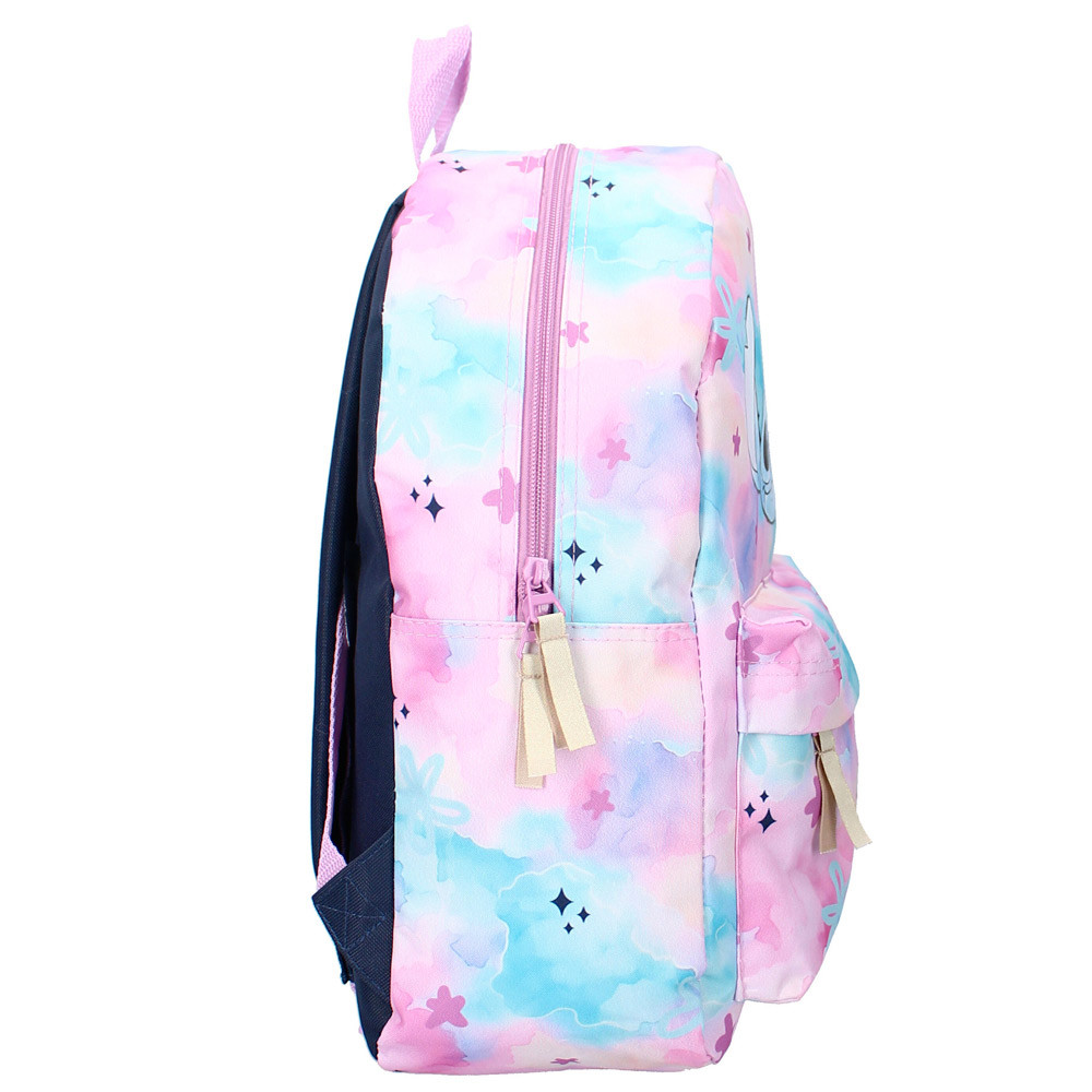 Su diseño en colores pastel, que mezcla patrones rosas, azules y suaves, crea un universo tranquilizador y alegre. La ilustración de Stitch aporta un toque emocional que atrae inmediatamente a los niños y convierte cada día escolar en uno agradable.
