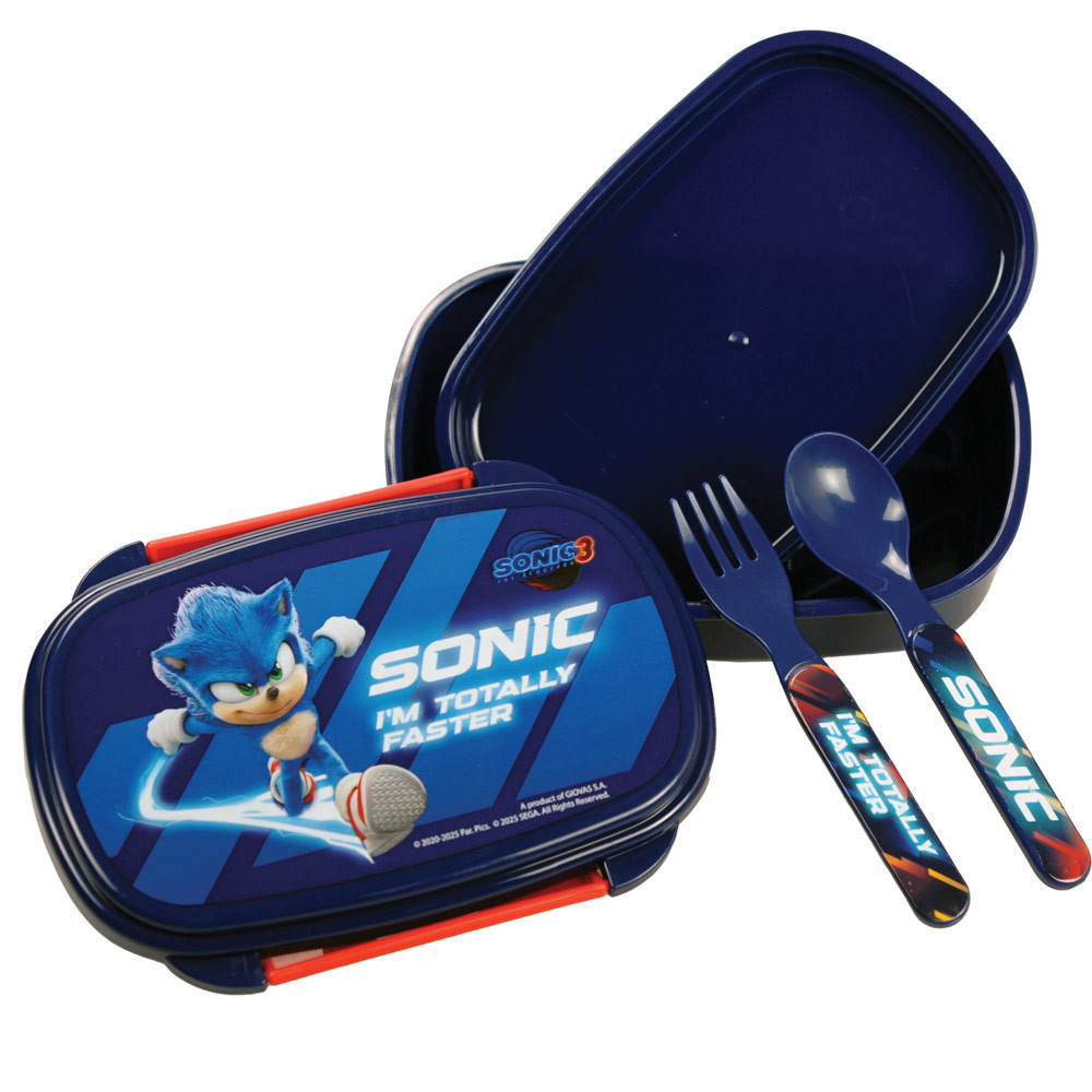 Esta caja se suministra con Cuchara y tenedor variados, con el diseño ultra elegante de Sonic y las letras "I'm totally faster", para un paquete 100% coordinado. Los cubiertos se pueden guardar fácilmente en el interior, lo que evita olvidos o pérdidas, y permite a los niños ser perfectamente independientes en la escuela o en las salidas.