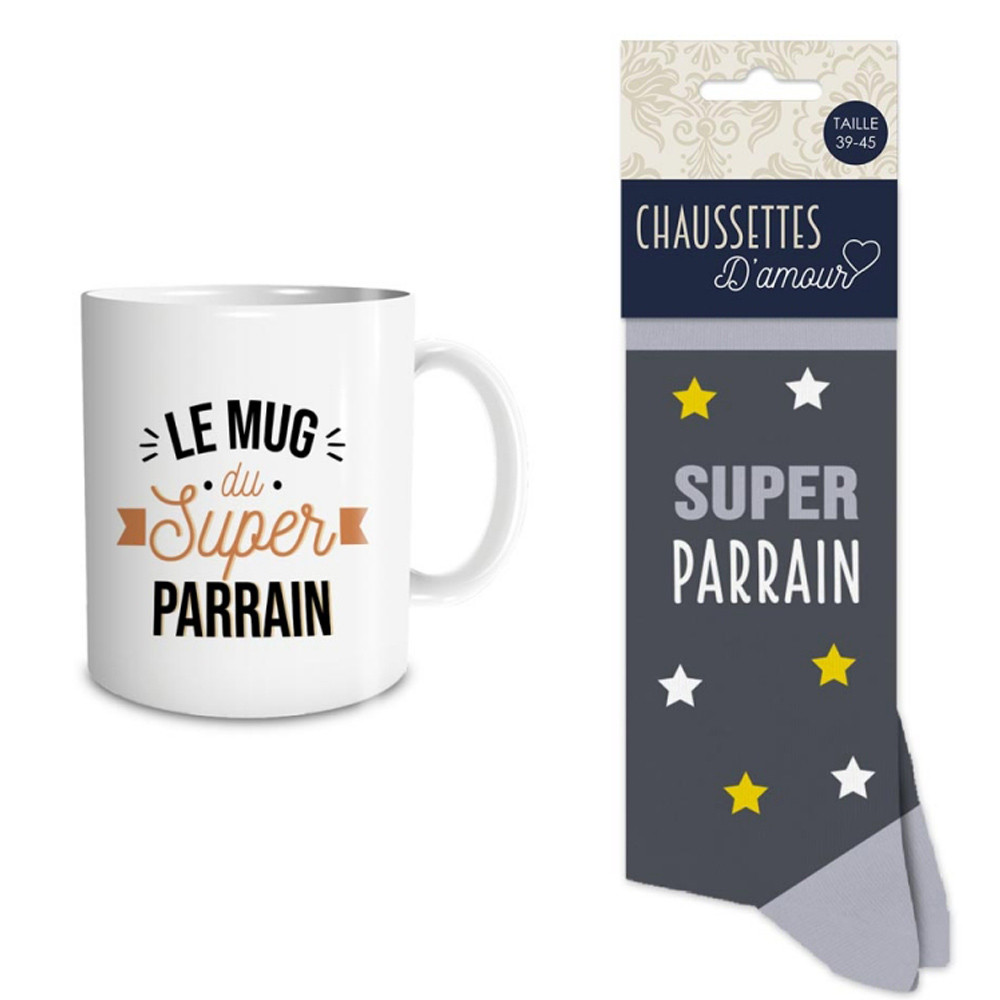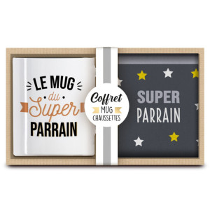 Para completar este regalo, se incluye en la caja un par de calcetines cómodos. Sobre un elegante fondo gris, llevan con orgullo la inscripción "Súper Padrino" rodeado de estrellas amarillas y blancas. Diseñados para proporcionar calidez y comodidad, vienen en talla única (39-45) y se adaptan fácilmente a la mayoría de los pies. ¡Perfecto para las noches de capullo o para añadir un toque divertido a tu look diario!