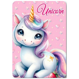 Sobre un fondo rosa suave adornado con corazones y estrellas brillantes, un adorable unicornio con grandes ojos brillantes y una melena multicolor ocupa el centro de la manta. Su diseño es a la vez infantil y mágico, perfecto para estimular la imaginación de los más jóvenes y añadir un toque colorido a la decoración de una habitación o un rincón de lectura acogedor.
