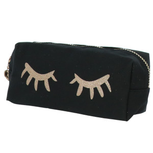 Interamente nero, questo astuccio è sublimato da un motivo originale di ciglia dorate glitterate che evoca occhi chiusi, portando una nota dolce e femminile, allo stesso tempo di tendenza e poetica. La chiusura con cerniera robusta è adornata da un ciondolo a forma di cuore, aggiungendo un tocco raffinato che piacerà alle adolescenti attente ai piccoli dettagli.