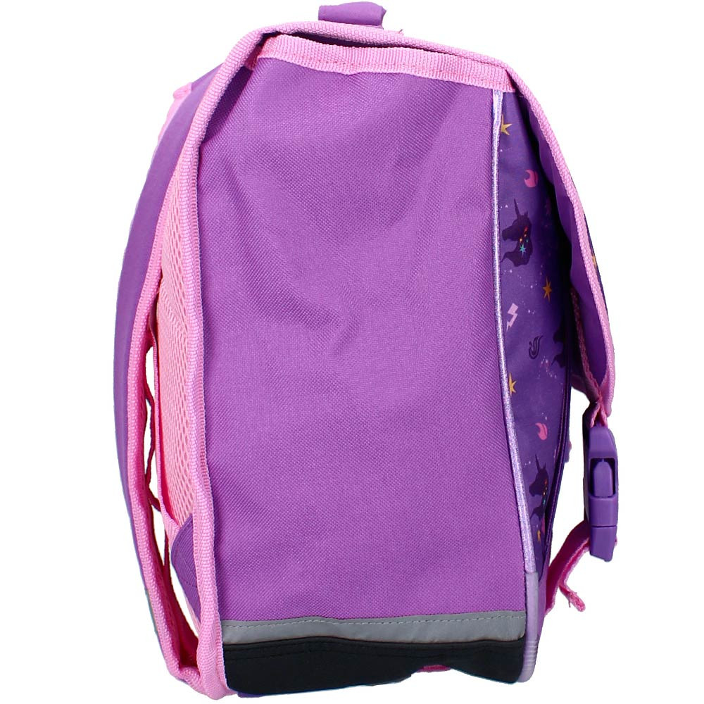 Progettata per sicurezza e comfort, questa borsa per bambini della primaria è dotata di strisce riflettenti sul retro, garantendo una migliore visibilità durante i viaggi, specialmente in inverno o a fine giornata. La sua chiusura pratica con 2 clip in PVC (tucs) permette un'apertura e chiusura semplice e adatta ai bambini.