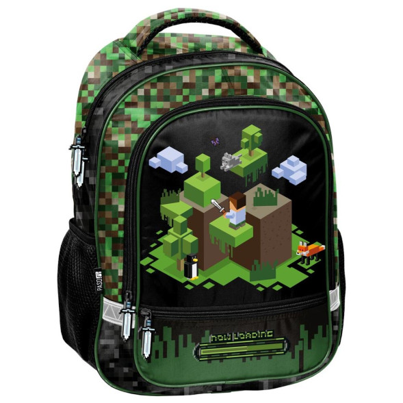 Realizzato con materiali resistenti, questo zaino unisce durabilità e originalità, rimanendo perfettamente funzionale per un uso quotidiano. La sua palette di verdi e neri con motivi pixelati piacerà particolarmente agli amanti del gaming e agli appassionati di universi digitali.