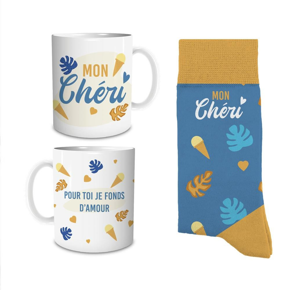 Con questo set Tazza e Calzini "Mon Chéri", avete tra le mani il regalo perfetto per sorprendere la vostra metà con tenerezza e una buona dose di buonumore! Un duo originale, colorato e pieno d'amore che farà sciogliere tutti i cuori, proprio come il messaggio pieno di umorismo che accompagna la tazza: "Per te mi sciolgo d'amore". Questo cenno dolce e romantico è valorizzato da un design estivo con coni gelato, foglie tropicali e piccoli cuori, il tutto in tonalità delicate di blu, giallo e arancione.