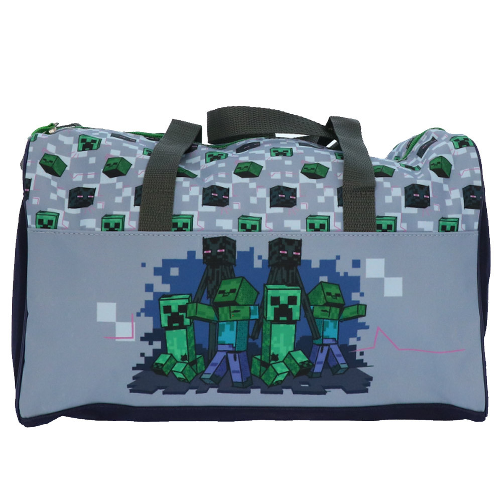 Het ontwerp van de tas zal onmiddellijk fans van Minecraft aanspreken: een dynamische scène waarop verschillende iconische personages zoals de Creepers, Endermen en Zombies zijn afgebeeld, gedrukt in een gepixelde stijl trouw aan het spel. De bovenkant van de tas is versierd met een herhalend patroon van Creeper-hoofden op een lichtpaarse achtergrond, wat een speelse en stijlvolle toets aan het geheel toevoegt. Deze mix van heldere kleuren en monsterbeelden geeft de tas een avontuurlijke uitstraling klaar voor alles, terwijl hij leuk en kinderlijk blijft.