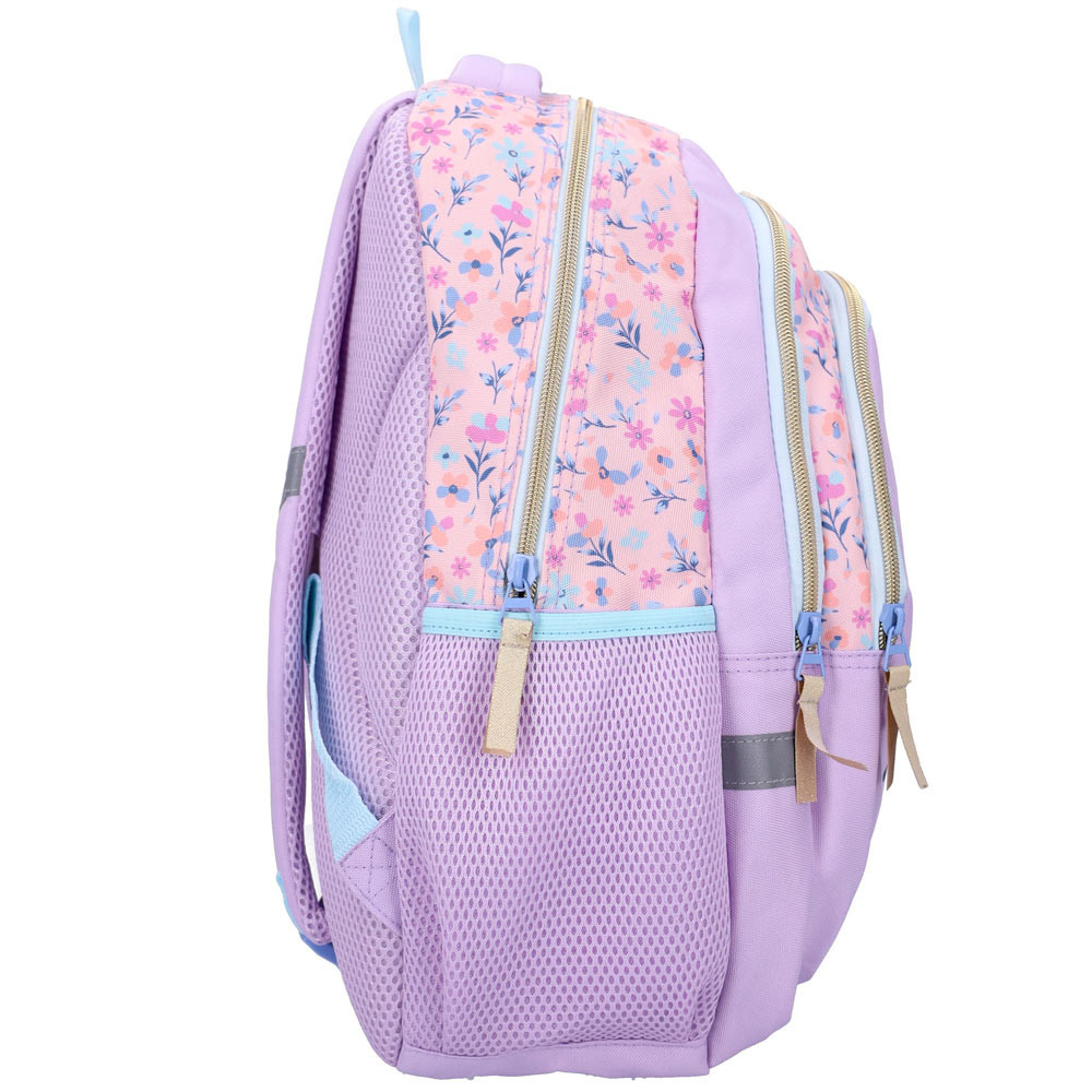 Het ontwerp in zachte tinten paars en bloemmotieven geeft een moderne en rustgevende uitstraling. Stitch' dynamische artwork maakt deze tas bijzonder aantrekkelijk, waardoor kinderen enthousiast hun spullen willen inpakken.