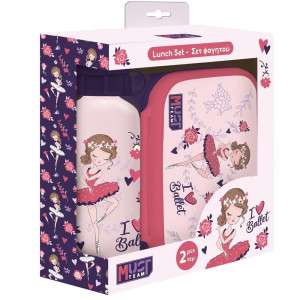 De Must "I Love Ballet" lunchset is de perfecte set om de kleine dansliefhebbers gedurende hun schooldag of uitstapje te begeleiden. Het bestaat uit twee praktische en bijpassende elementen: een lunchbox van PVC en een aluminium drinkfles, beide versierd met een mooie ballerina omringd door bloemen en harten, in zachte tinten van roze, paars en rood.